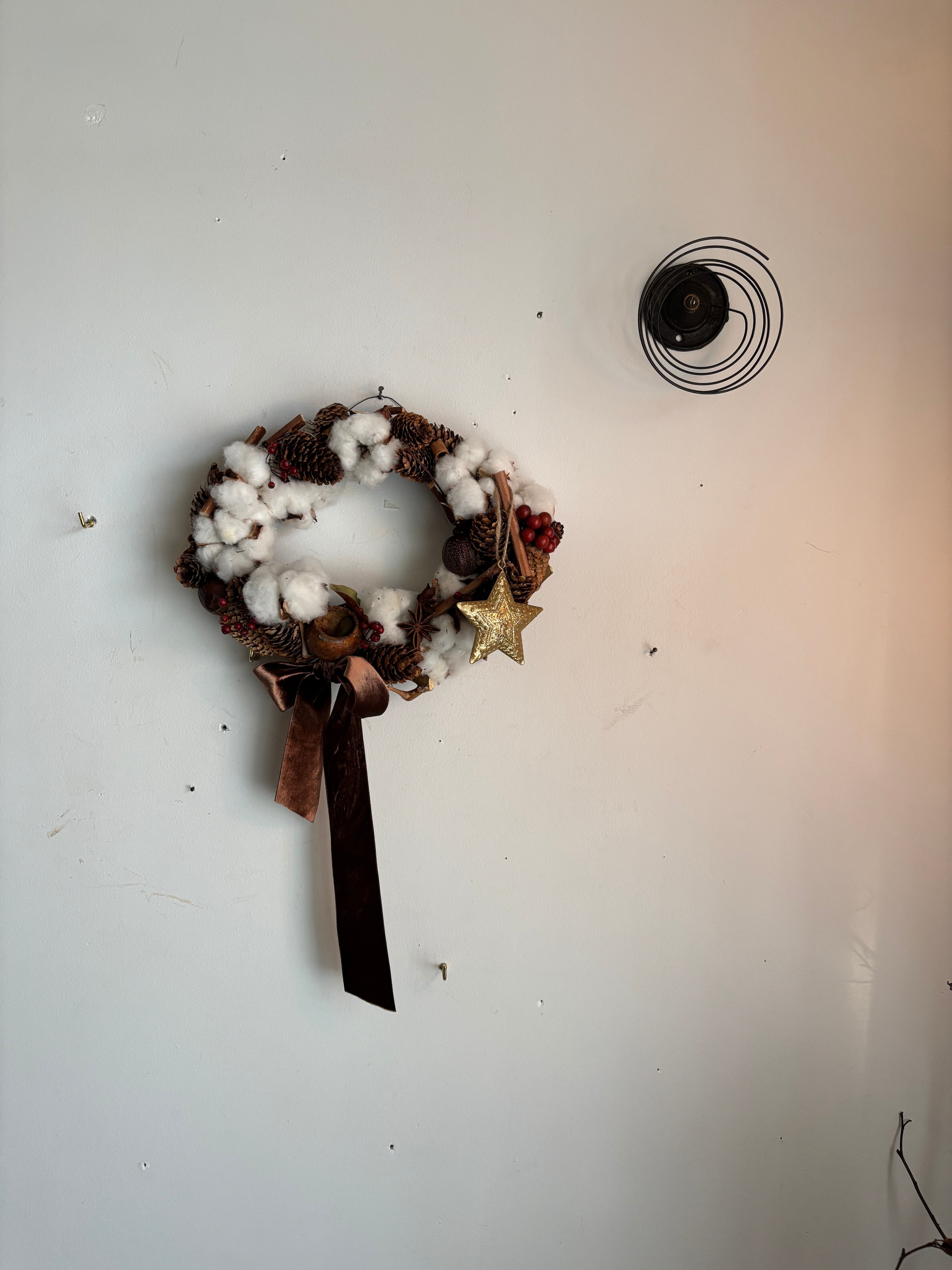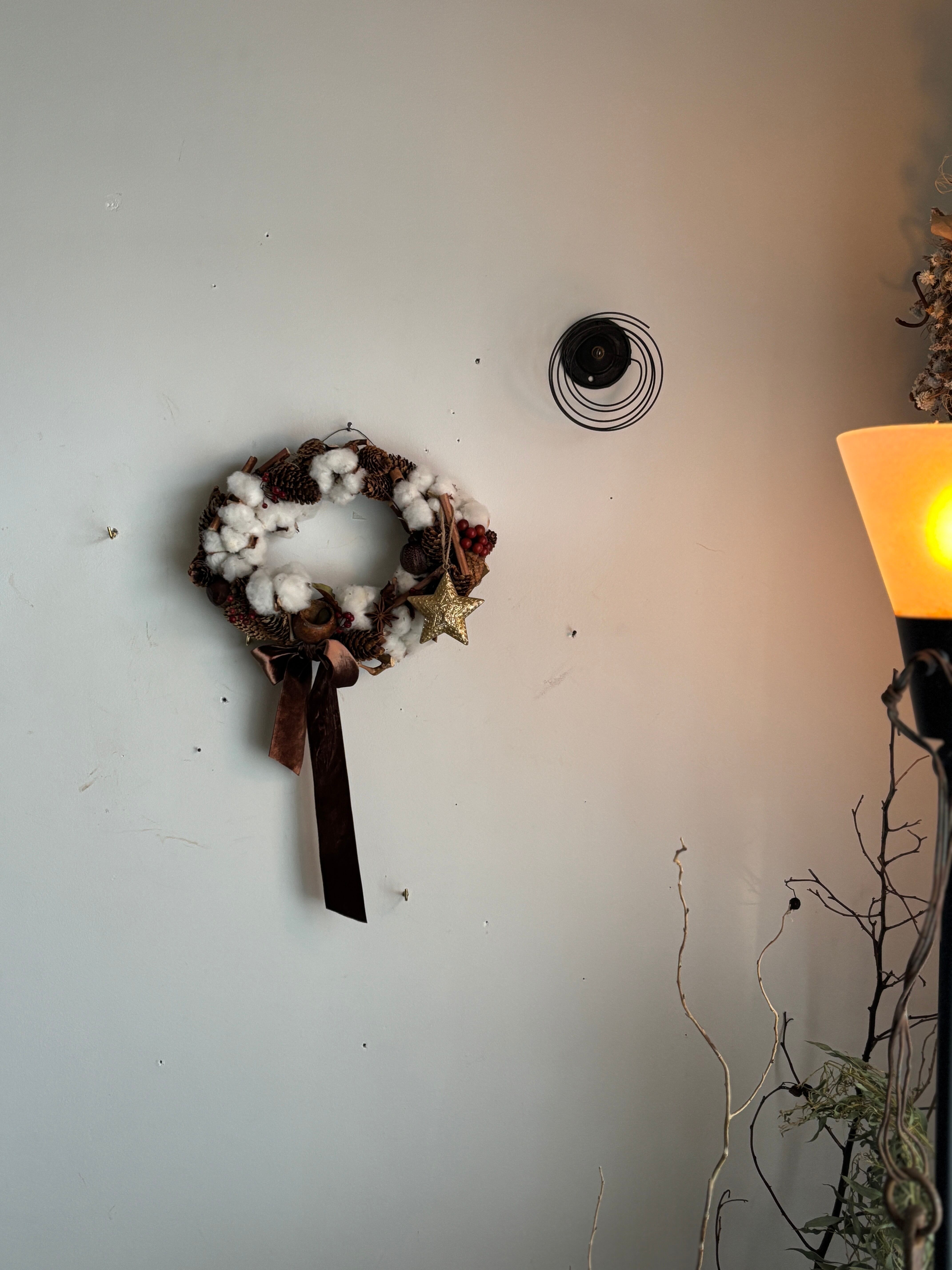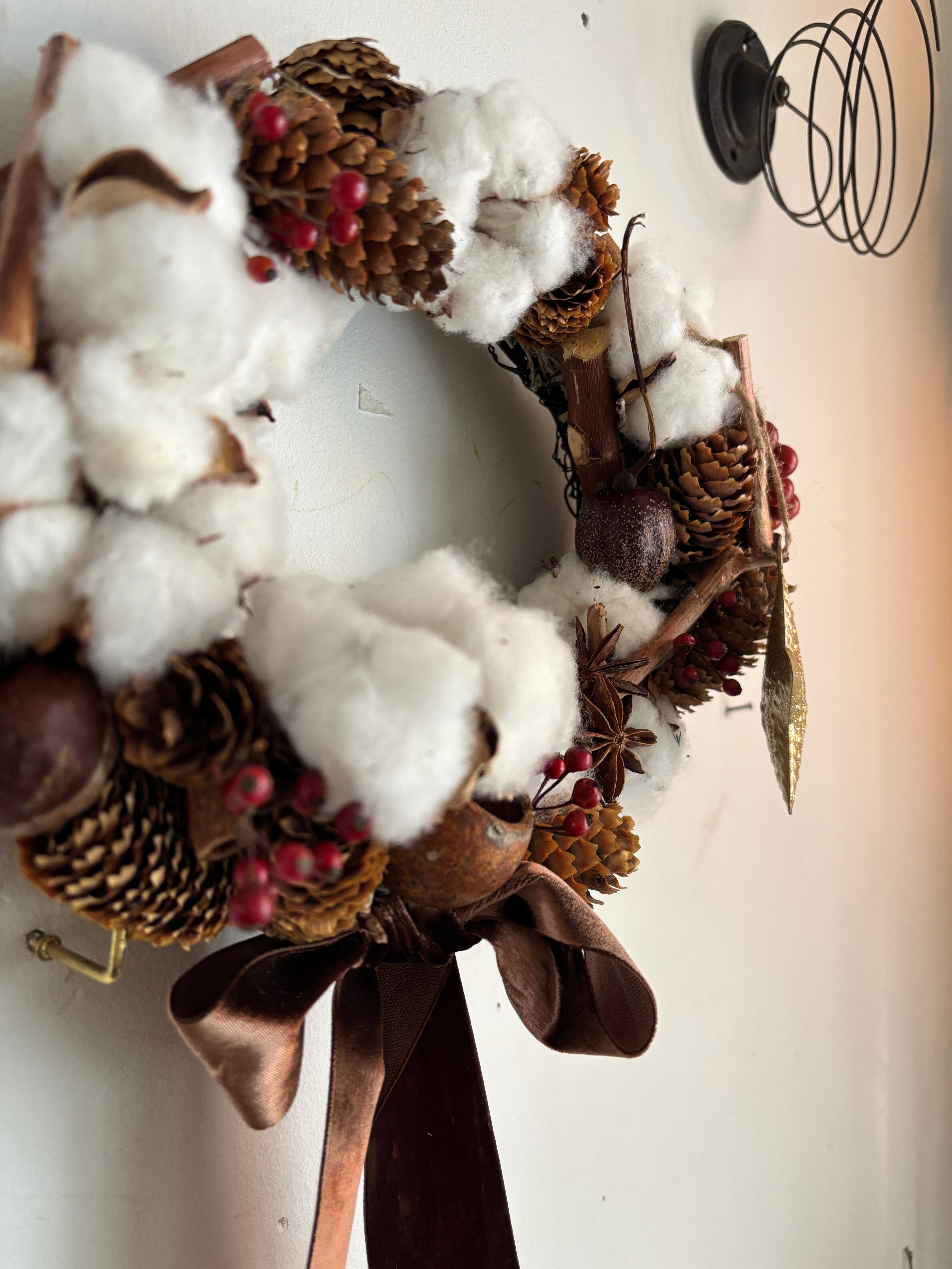 ふわふわコットンと美しい木の実のリースは、クリスマスシーズンの雰囲気を引き立てるアイテムです。暖かみのある色合いが、リビングや玄関を彩り、心を豊かにしてくれます。