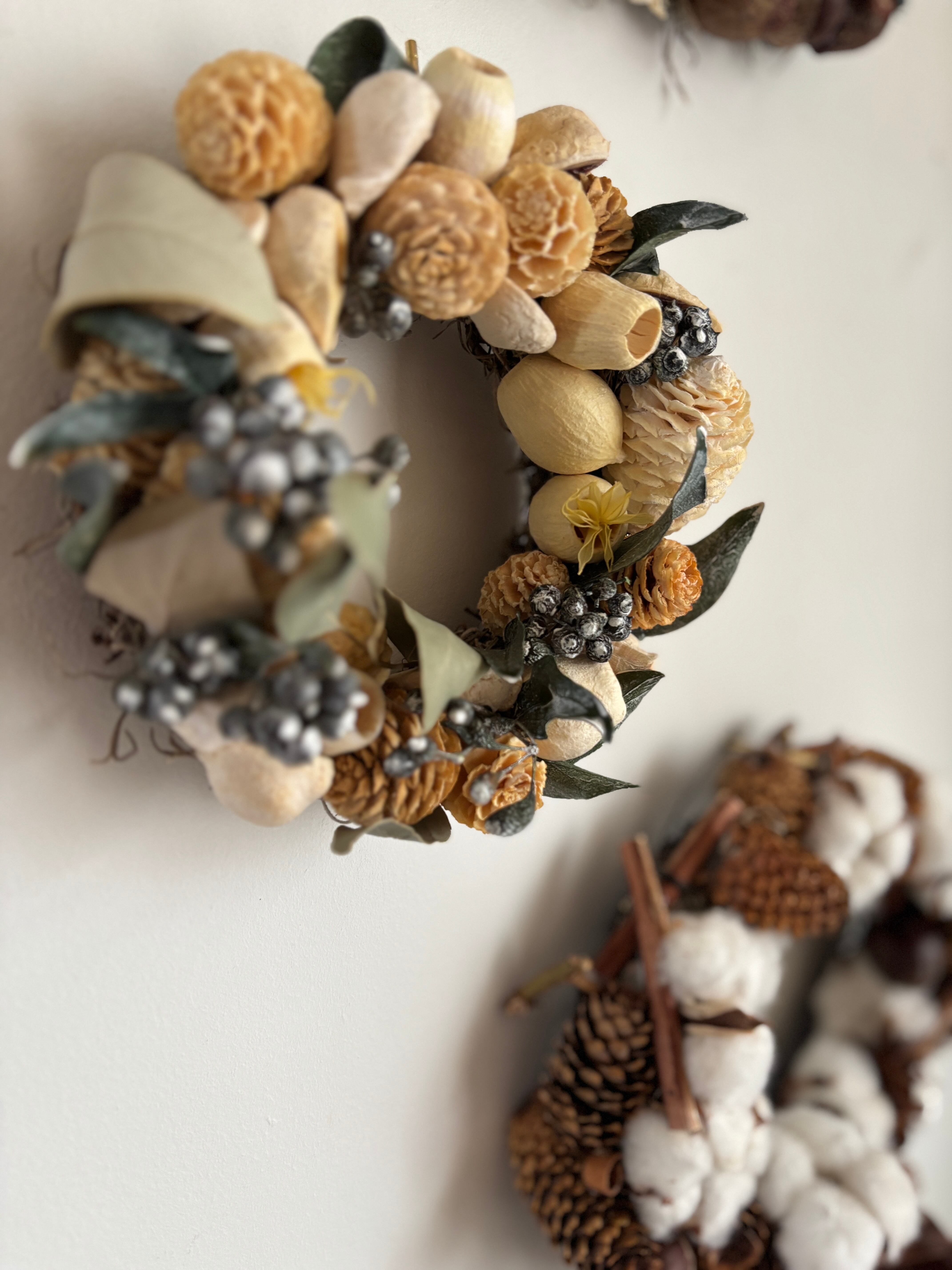 ホワイト加工された木の実をふんだんに使用した「木の実のリース(真ん中)」は、ナチュラルで愛らしい見た目が特徴のインテリアアイテムです。お部屋のあらゆる場所に取り入れることで、柔らかな雰囲気を演出し、訪れる方々に心地よい心安らぐ空間を提供します。また、季節感を豊かに感じさせ、インテリアに華やかさを添えてくれるリースです。