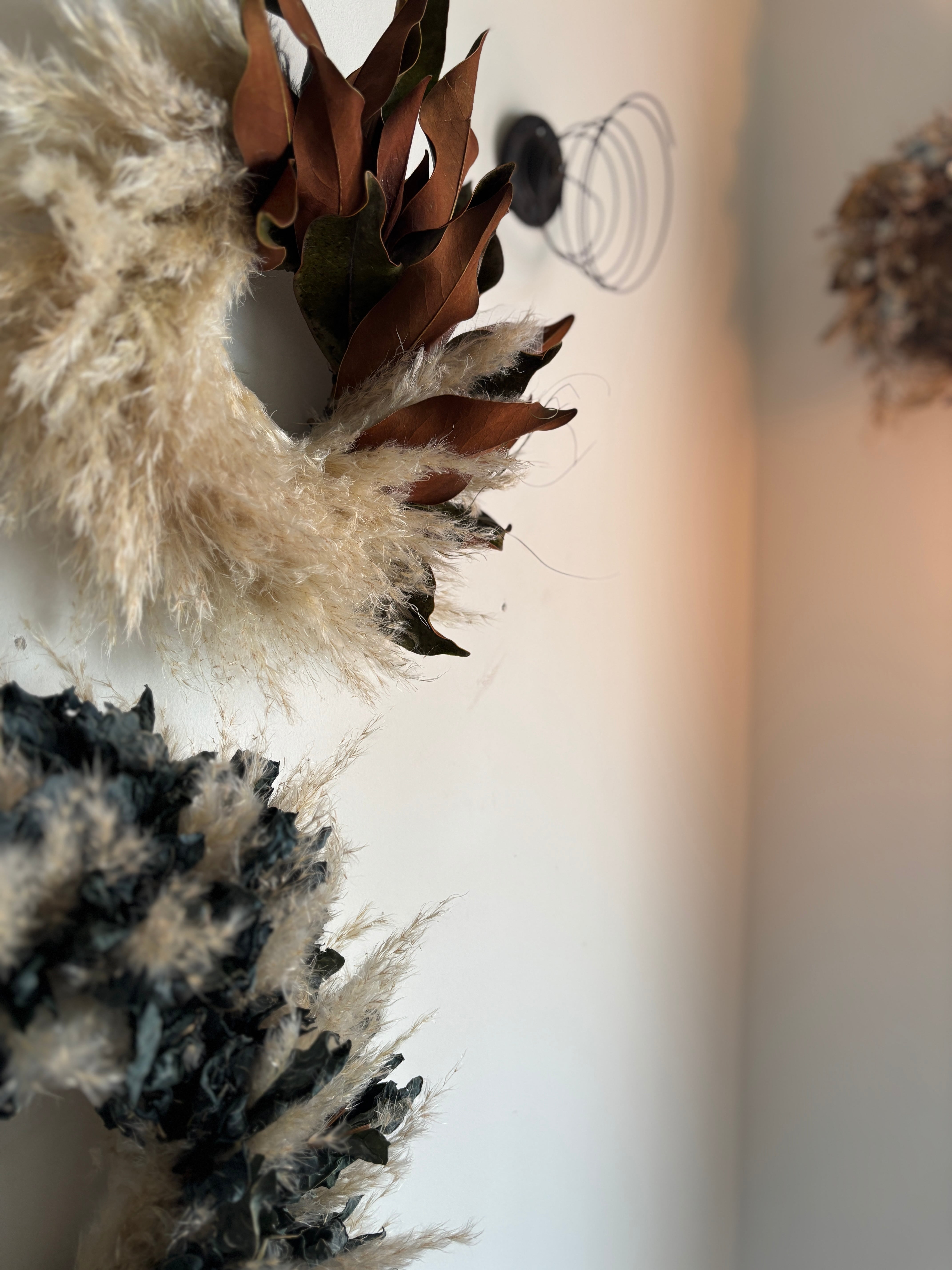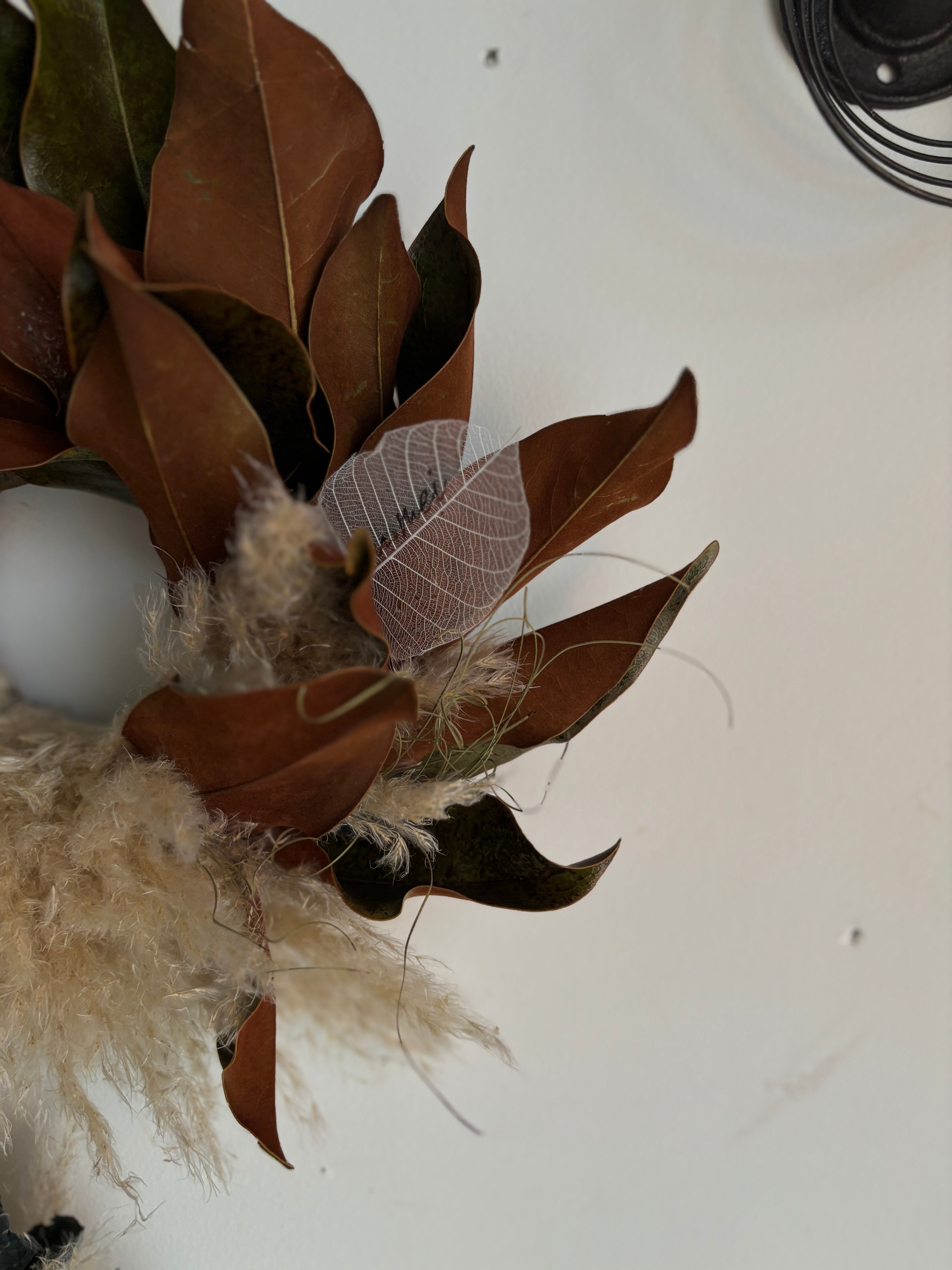 ふわふわなパンパスグラスとスエードのような質感のマグノリアの葉を贅沢に使用した「ワンポイントスケルトンリーフ付きパンパス×マグノリアのリース」は、秋の訪れを感じさせる魅力的なインテリアアイテムです。優美なデザインがリビングや玄関を彩り、訪れる方々に心地よい安らぎを届けます。柔らかな色合いが、秋の温もりを感じさせる空間を演出します。さらに、ワンポイントのスケルトンリーフが可愛いアクセントになっており、見た目にも楽しませてくれるリースです。