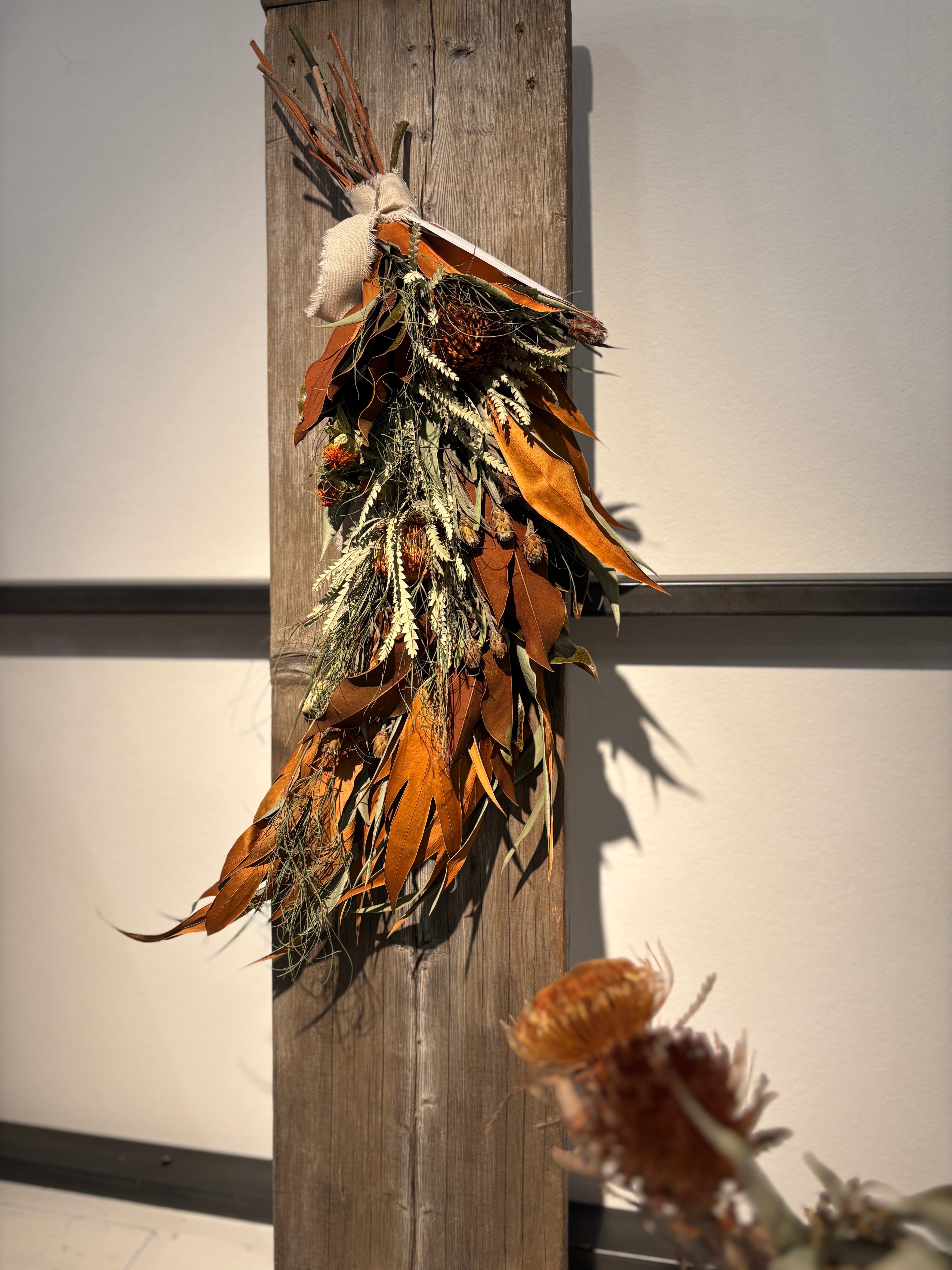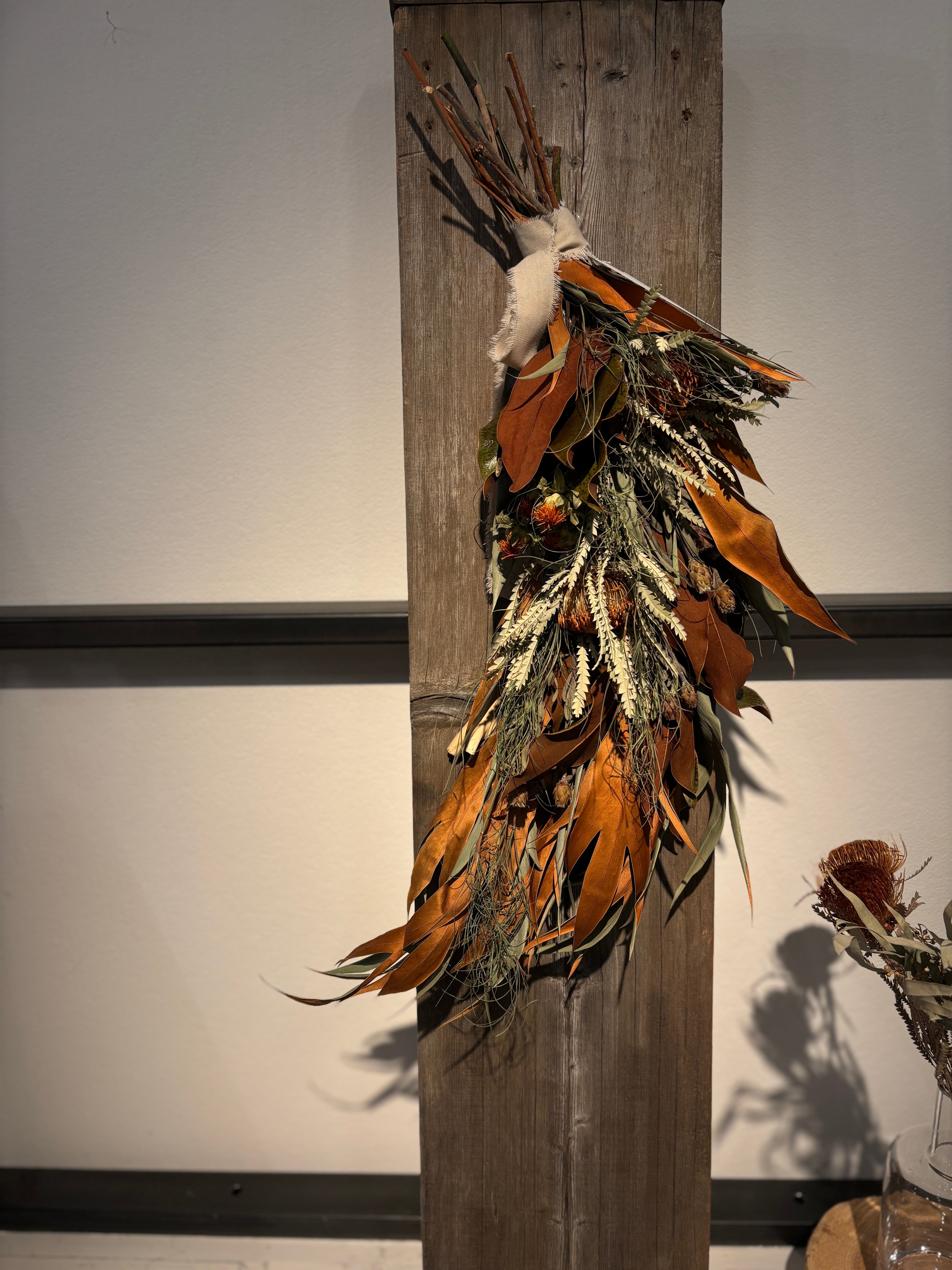 《秋色を彩るグレビレアとマグノリアのスワッグ》