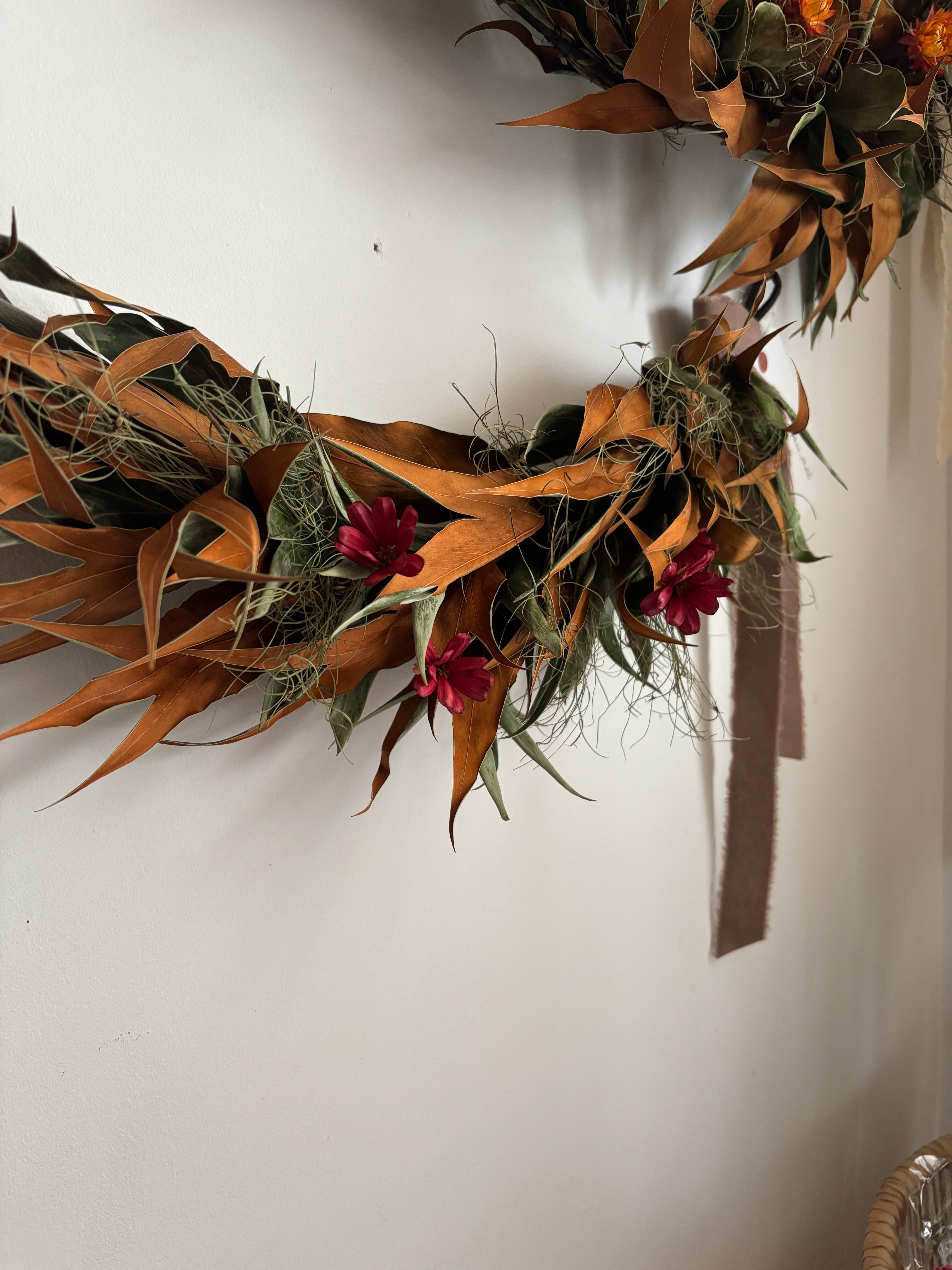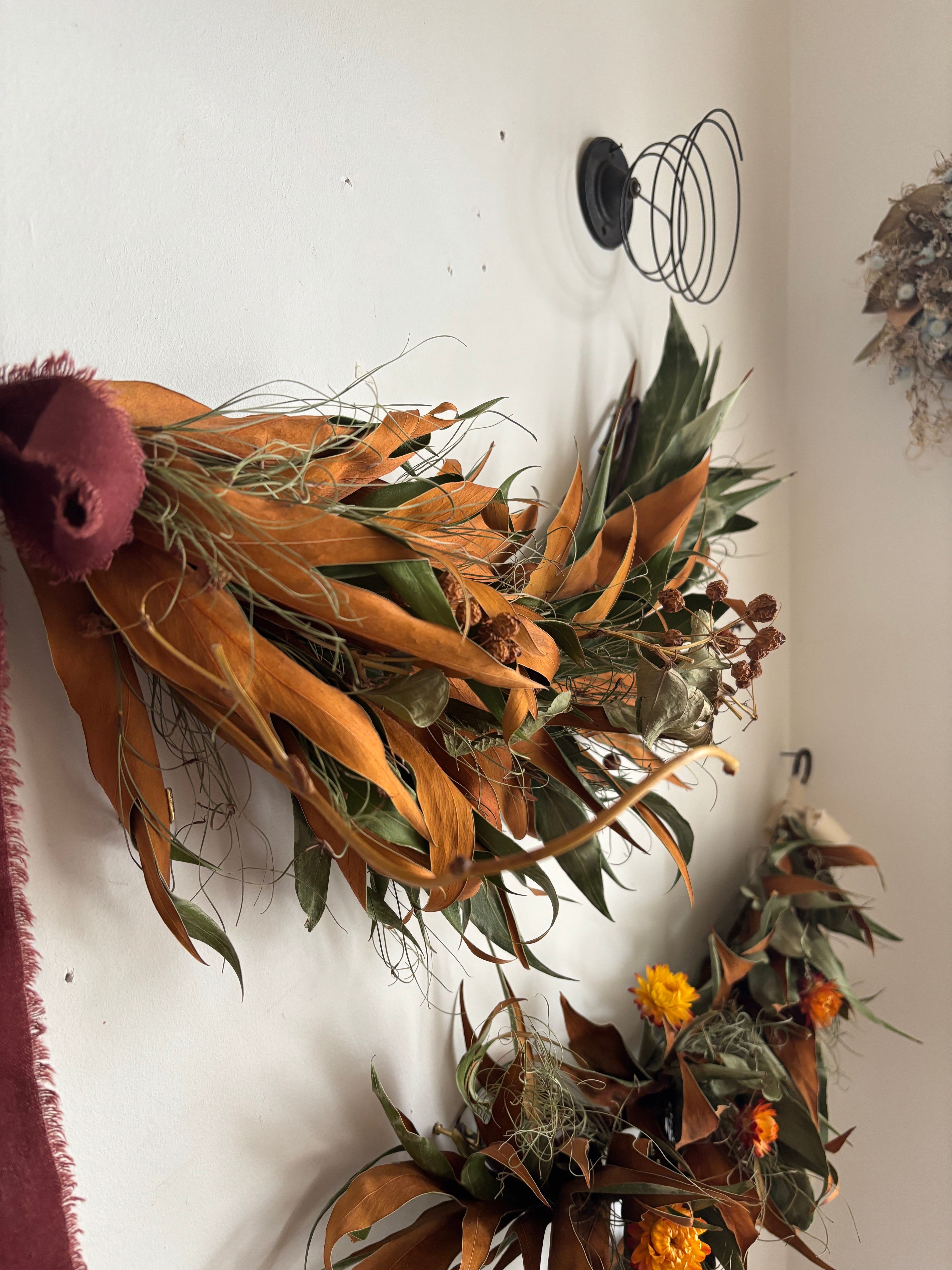 鮮やかなオレンジ色のグレビレアゴールドを贅沢に使用した「グレビレアのガーランドスワッグ」は、秋の訪れを感じさせる素敵なインテリアアイテムです。華やかさと落ち着きを兼ね備えたデザインが、リビングや玄関を彩り、訪れる方々に心地よい雰囲気を提供します。豊かな色合いと抜群の存在感が、空間に温かみを与え、ほっこりとした秋のムードを演出します。