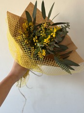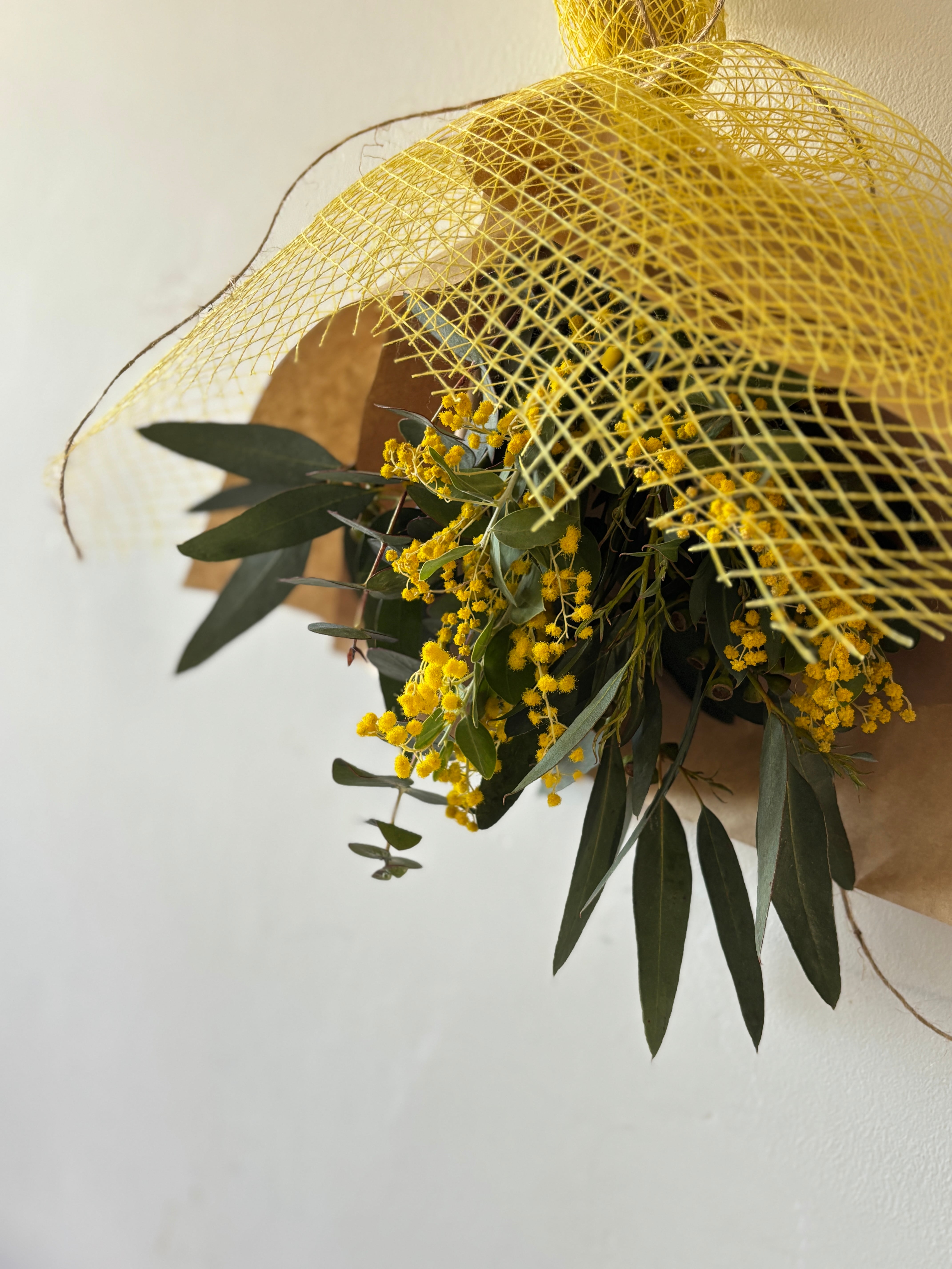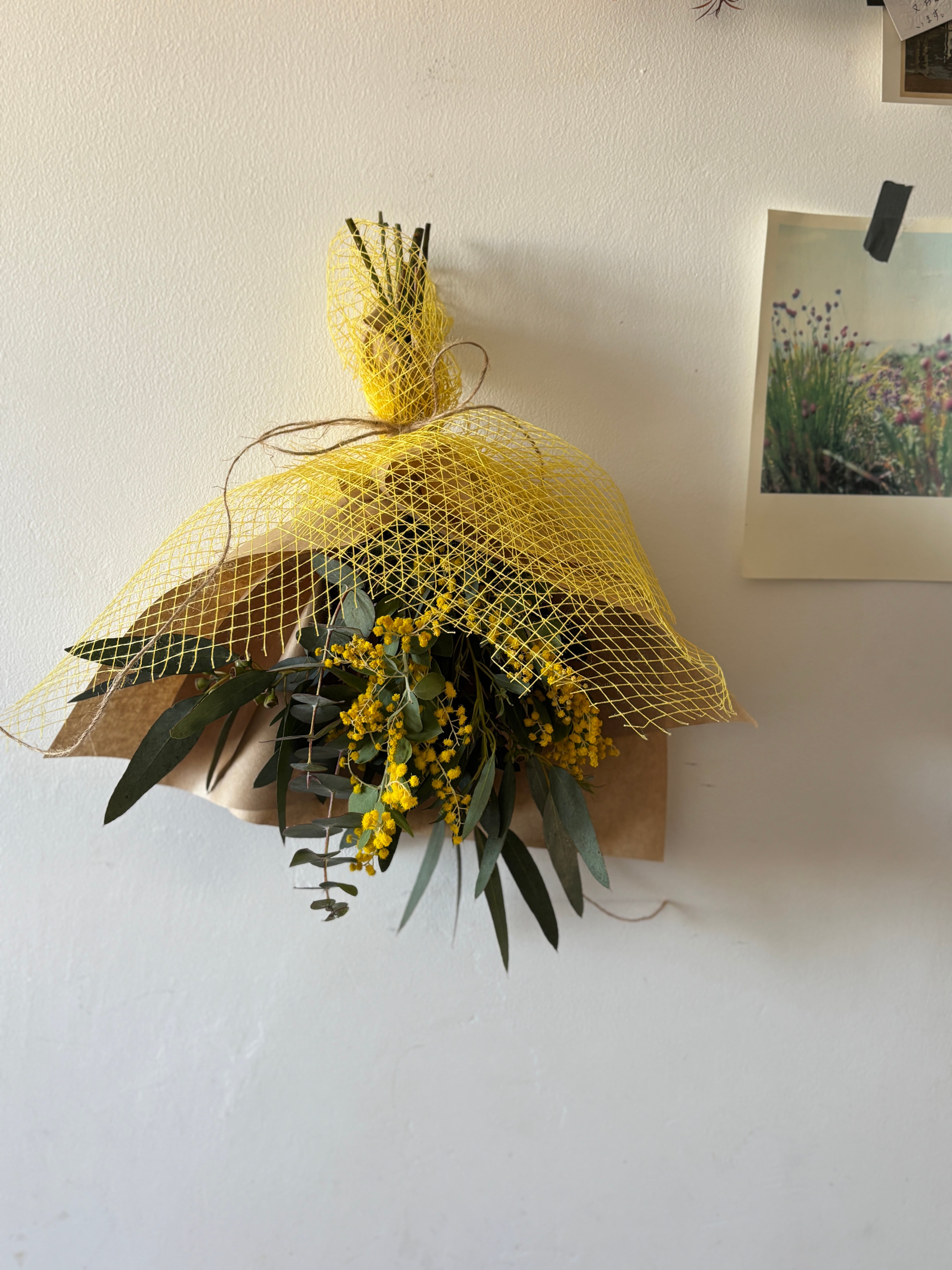 こちらに使用する真珠葉アカシアは、長作園 雪風さんの美しいミモザ。乾いてもくすむことのない美しいレモンイエローの花と、艶のあるグリーンの葉をたっぷりお楽しみいただけます。