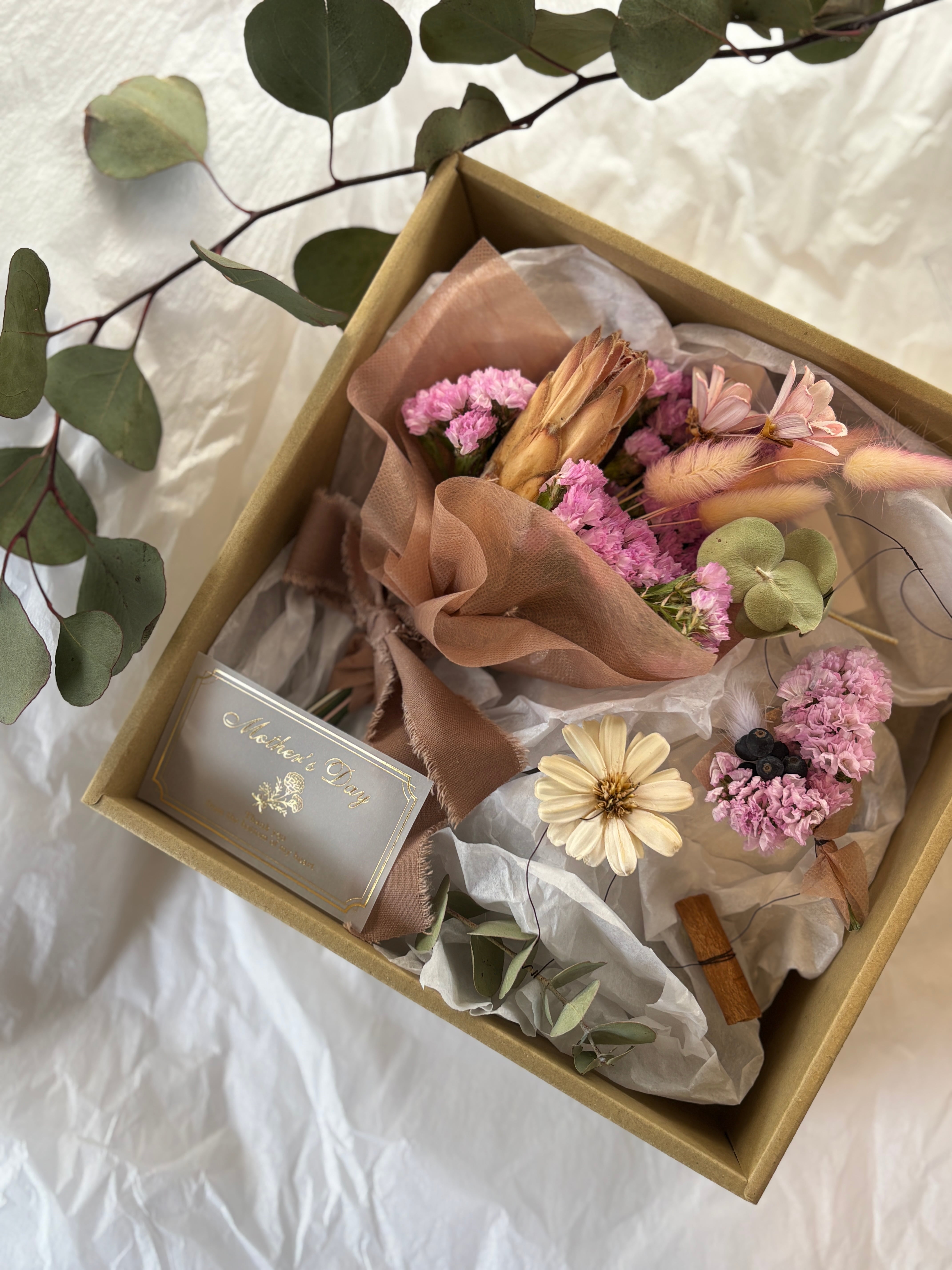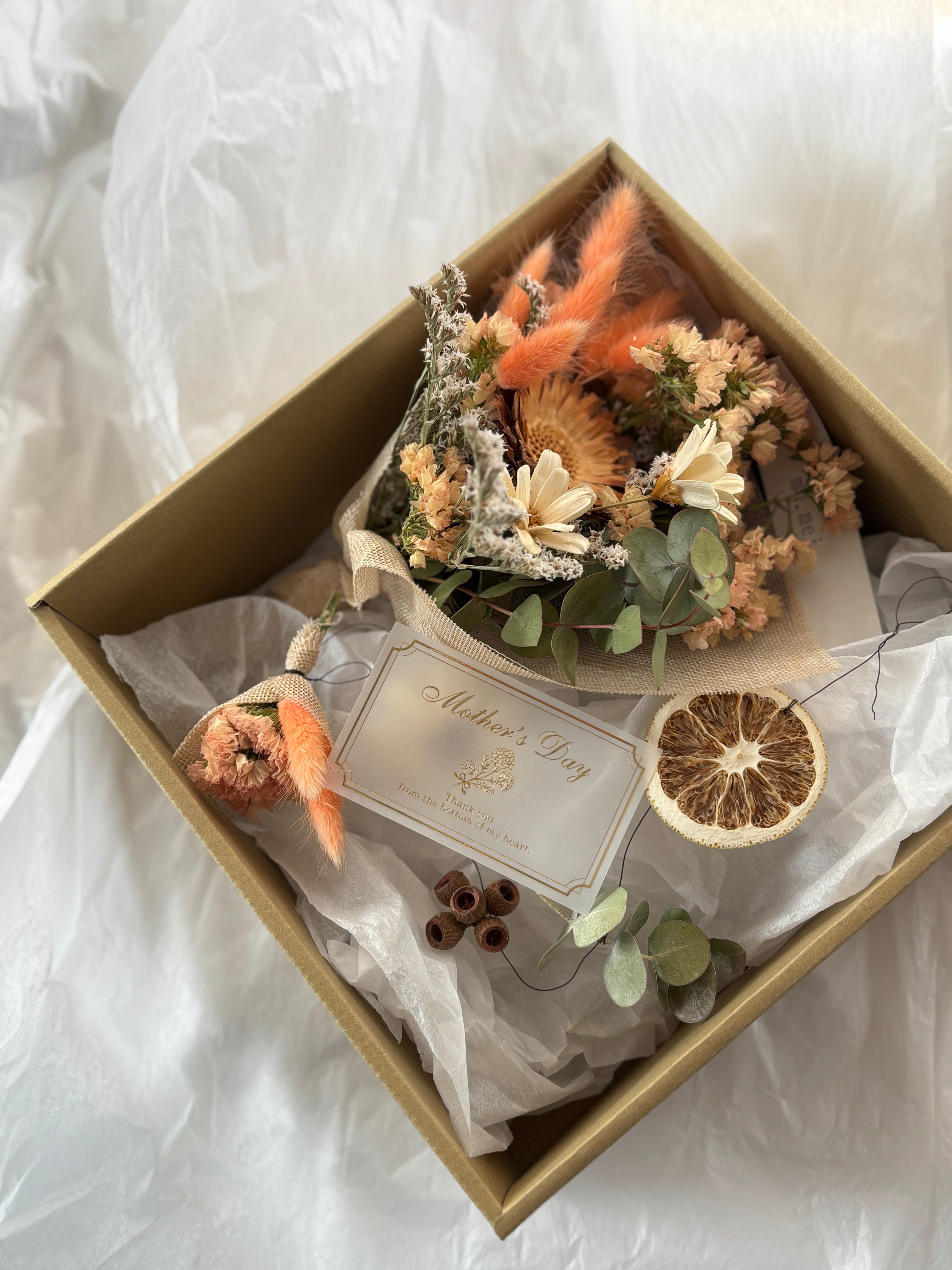 定番のミニブーケとモビール(10連)を1つのボックスにまとめたギフトボックス。