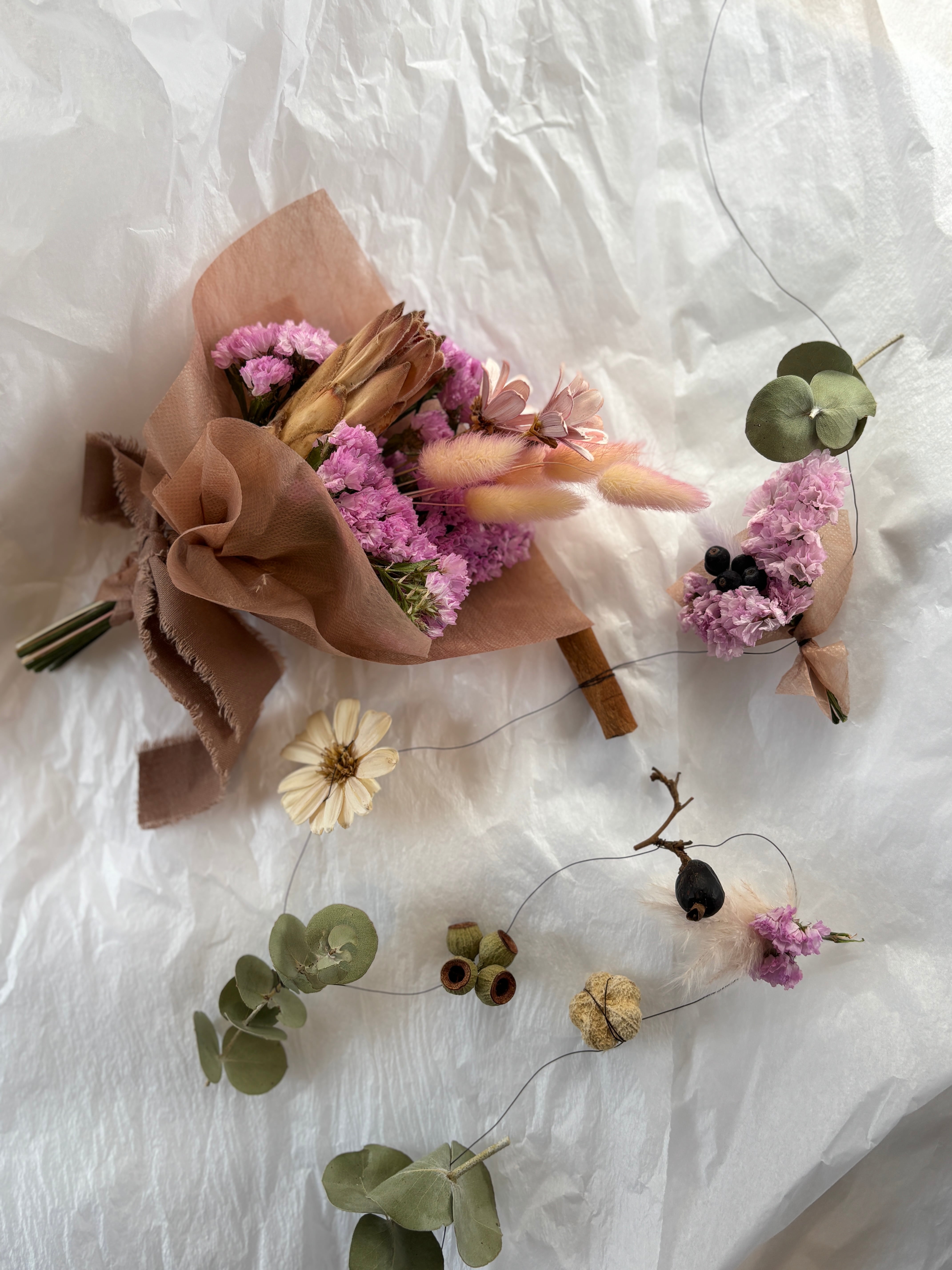 ・ドライフラワーの特性として、色は段々と抜けていき変化していきます。個体差はありますが、その過程もお楽しみいただけたら幸いです。直射日光や高温になる場所を避けていただくと、比較的色が長持ちいたします。
